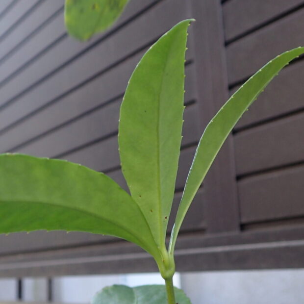 先がとがり、 するどいギザギザのある葉です。 対生で、 2枚の葉が向かい合ってつきます。 枝から伸びる2枚の葉は、 つけ根で滑らかにツルンとつながって見えます。