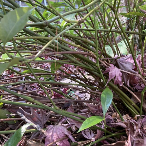 幹、 枝は緑色や褐色であまり太くはならず、 木質化もしません。 株元からたくさんの幹を伸ばし、 支え合っているように見えます。 枝分かれしたり実がなったりすると、 株の外側の枝は重くなって倒れ込むことがしばしばです。