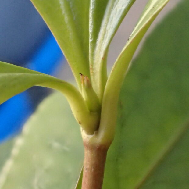 葉や枝と同じような色のツンととがった芽です。 毛や、 芽を包む皮はありません。