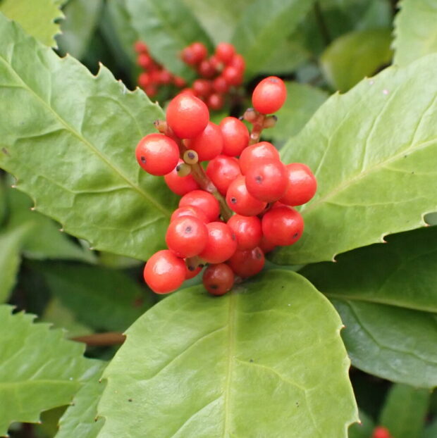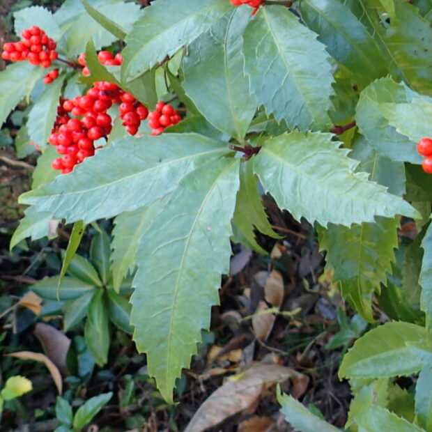 庭木や鉢植えとして栽培されます。 緑色の葉と赤い実のコントラストが美しく、 縁起のよい木ということで、 お正月の切り花としても定番です。