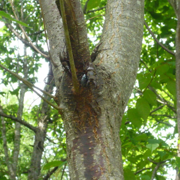 コナラの仲間で、 幹や枝に水分が多く、 燃えにくいことから「ミズナラ」と呼ばれるようになりました。 春先は成長が活発になるので、 幹や枝には樹液がたくさん流れます。 糖分を多く含んだ樹液が外に染み出すと、 夏にはそれを目当てにいろいろな虫が集まります。