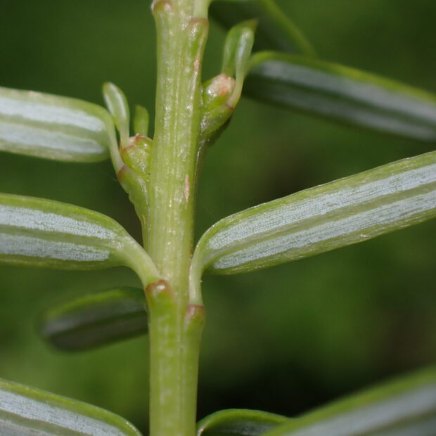 表面がつやつやの深緑色で細長く、 先は丸くて少しへこんでいるのが特徴です。 葉のつけ根には短い柄があり、 長さが長い葉や短い葉が枝にぐるりとつきます。 裏面には2本の白い線があります。