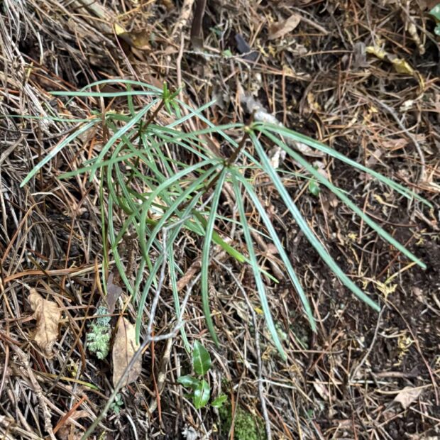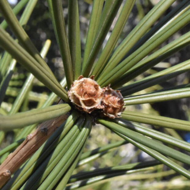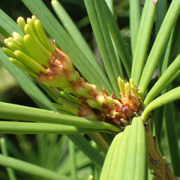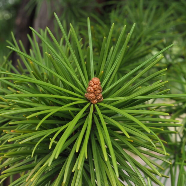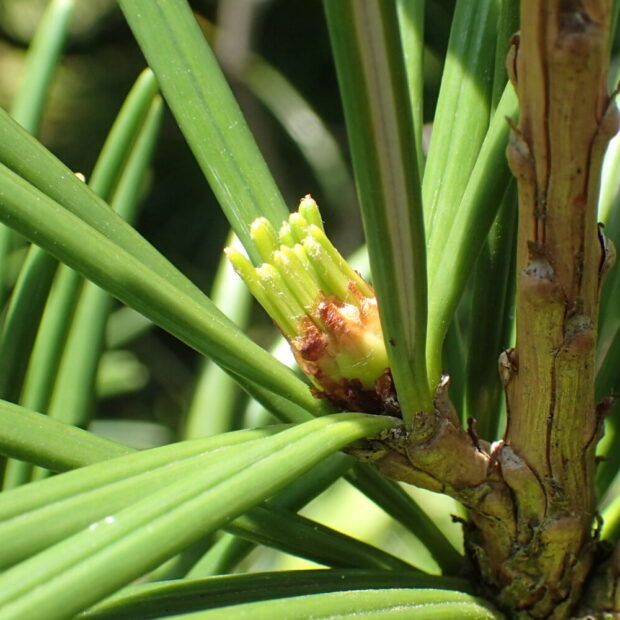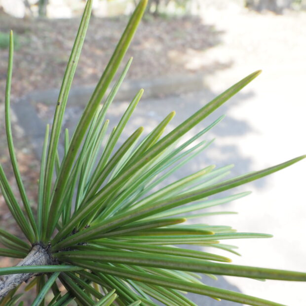 太さがあってやわらかい葉で、 2本の葉が側面で合わさって1本の葉になっています。 マツのように先がとがった針のような葉ではなく、 先は少しくぼんでいます。 枝先にぐるりと放射状に葉がつきます。