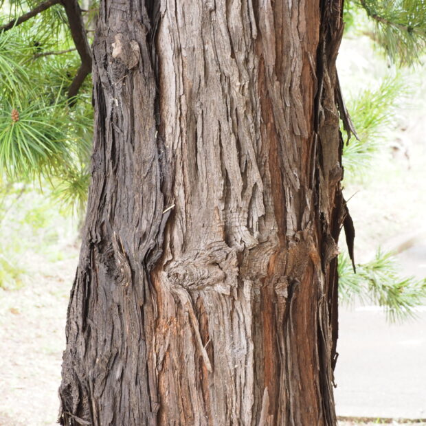 樹皮は厚くて灰色がかった茶色で、 繊維質で縦に裂け、 薄くはがれ落ちます。 若い枝は初めは緑色をしていて、 後から茶色くなります。
