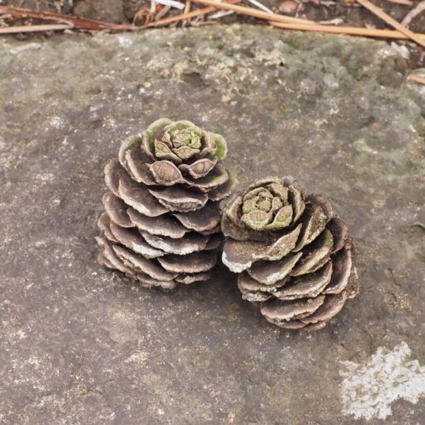 • 熟して落ちた球果。 大きさはクロマツの松ぼっくりと同じか少し大きいぐらい。