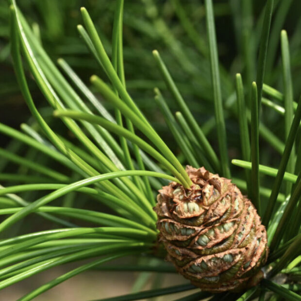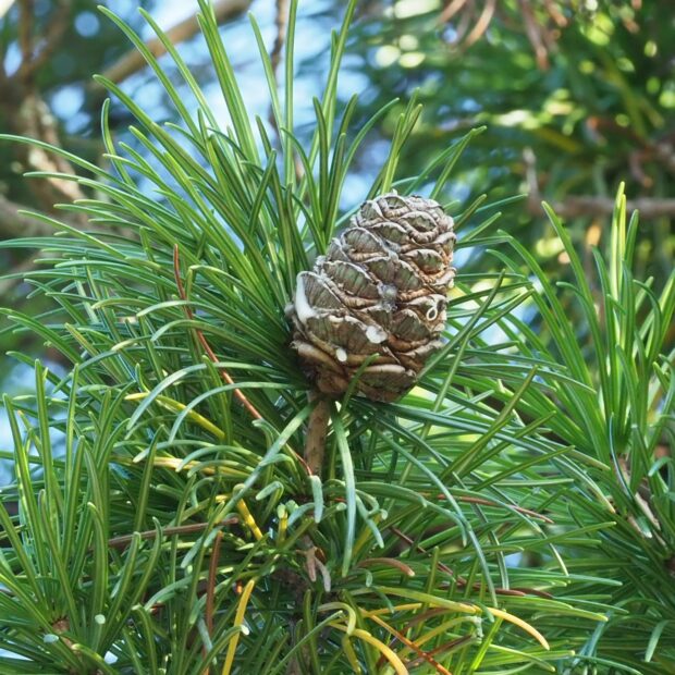 松ぼっくりのような球果が枝の先にできます。 花が咲いた翌年に熟し、 うろこのような部分の内側に種ができます。