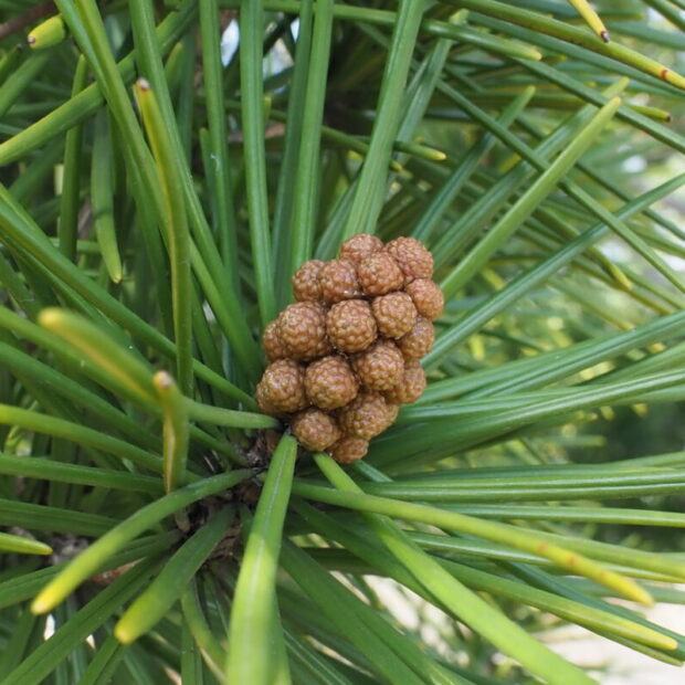 雄花は枝の先にでき、 30個ほどの花が集まっています。 雌花は楕円形で枝の先に1個だけつきます。