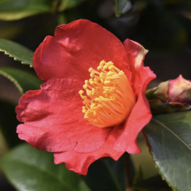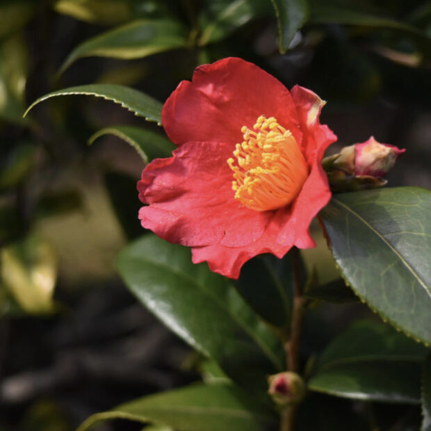 雪が解け始めたころから、 枝先に一重の赤い花をつけます。 花びらの厚みはヤブツバキより薄く、 雄しべの軸はオレンジ色がかった黄色であることが特徴です。