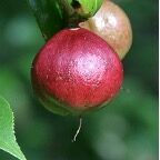 ほぼ球形ですが、 ヤブツバキより細長い実です。 実がなることは稀です。