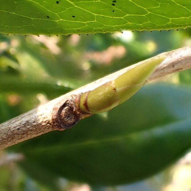先のとがった黄緑色の芽です。 花芽はぷっくりと丸みがあります。 葉痕の維管束痕は1つです。
