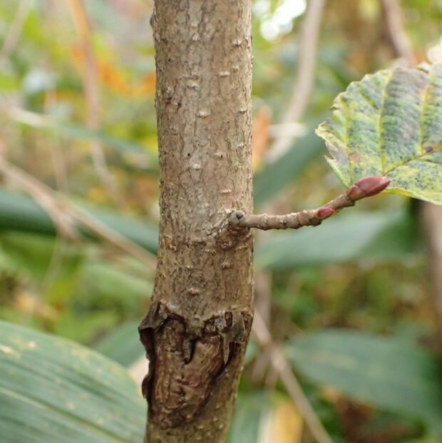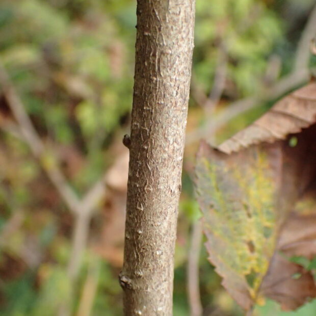 若い枝には毛がありますが、 太くなると灰色がかった薄い茶色になり、 表面はすべすべになります。 円形か、 横長の形のポツポツがあります。