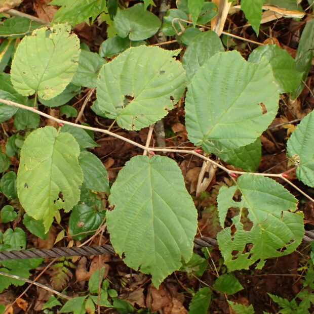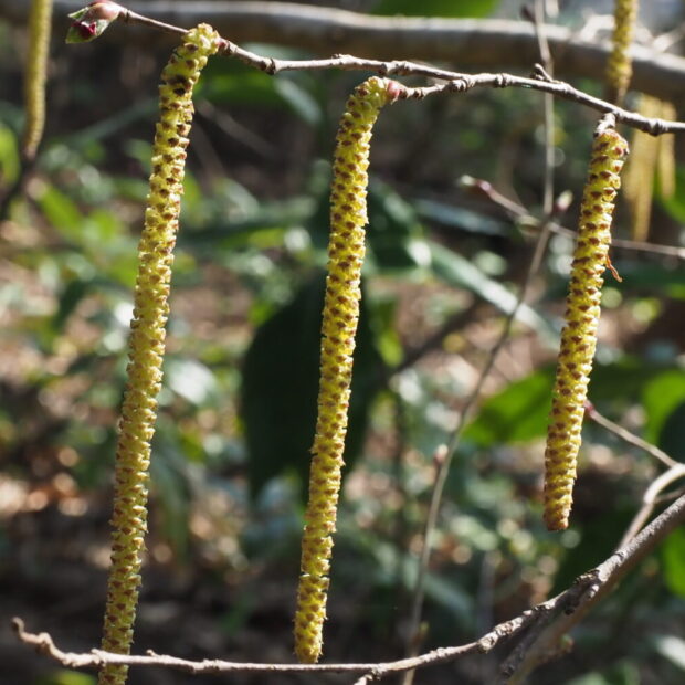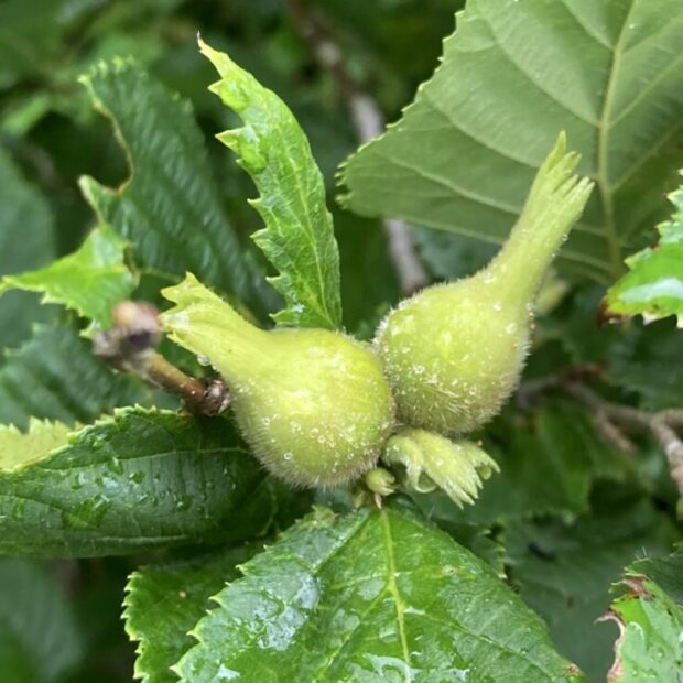 日本全国の山に自生しますが、 実の形が面白く、 食べられることもあって庭に植えられることも多いです。 同じ仲間のセイヨウハシバミの実はヘーゼルナッツとしておなじみ。 ナッツとして炒って食べたり、 チョコレートにくるまれているのを食べたりしますね。