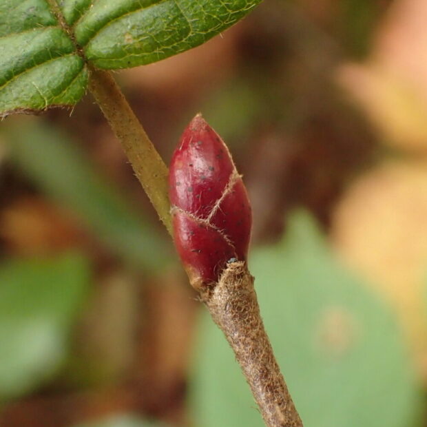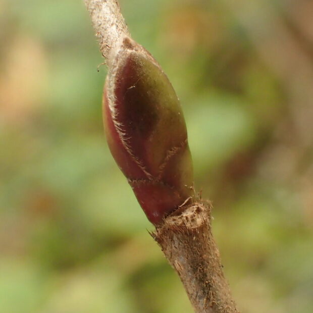 赤くてつやがあり、 水滴型の冬芽です。 縁に毛がある芽鱗は、 枚数は少ないのですが、 きれいに芽を包んでいます。