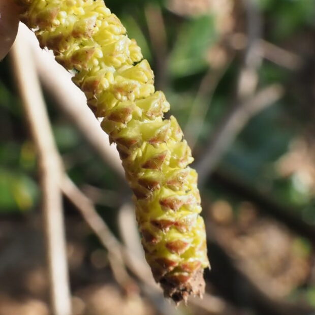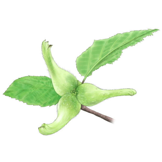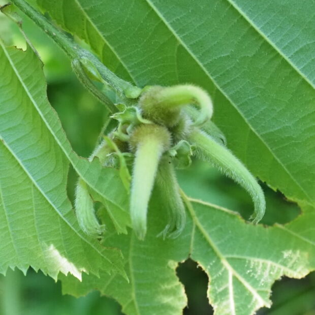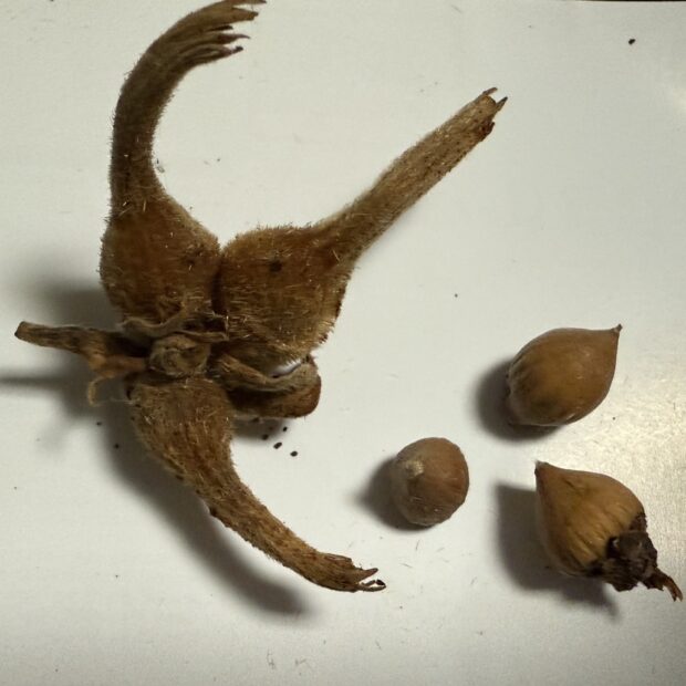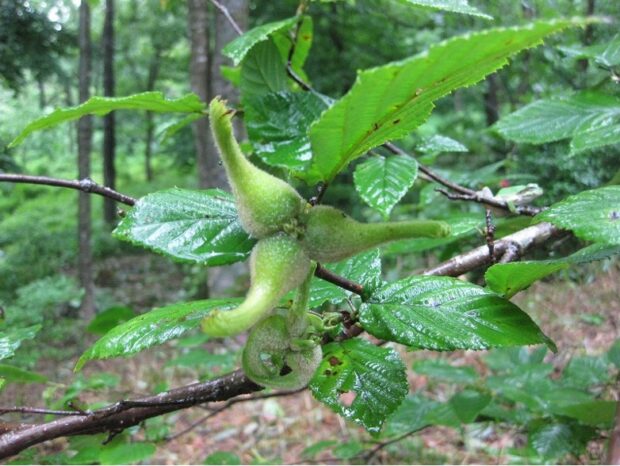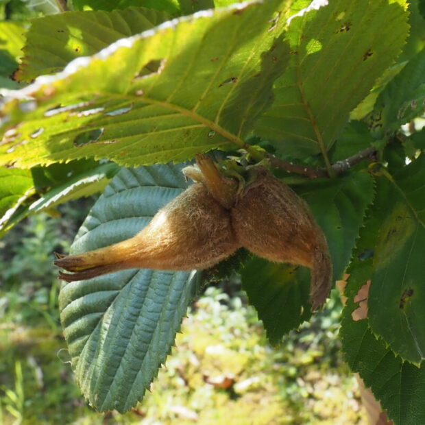 ハシバミの仲間の木で、 実にツノがあるような形をしているので「ツノハシバミ」と呼ばれています。 ヘーゼルナッツの仲間で、 実の中から出てくる堅果(どんぐりのようなタネ)は食べられます。