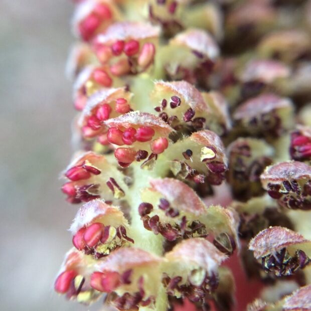 葉が出る前に、 雌花と雌花が別々に咲きます。 雌花には花びらのようなものはなく、 赤い雌しべがピロピロと出てイソギンチャクのような花です。 雄花の集まりは紐のように垂れ下がります。