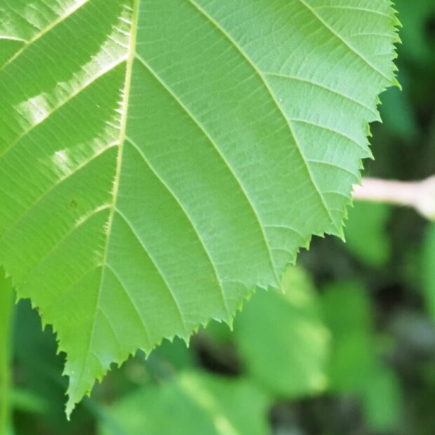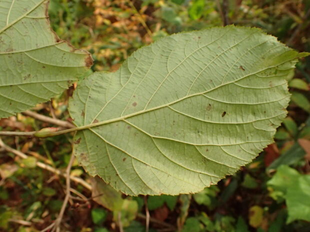 先は急にピュンと鋭くとがる葉で、 互生につき、 葉の縁のギザギザは不ぞろいです。 秋には黄葉します。