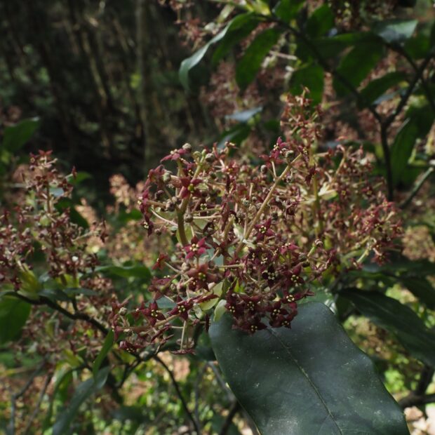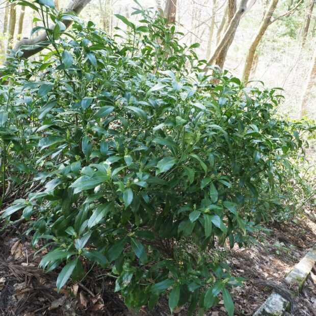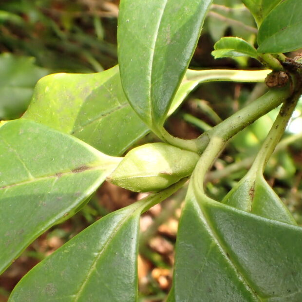 高さ1mほどの常緑樹です。 枝はまばらに生え、 大きな木の下でこんもりとした株立になったり、 はうように横に広がったりします。