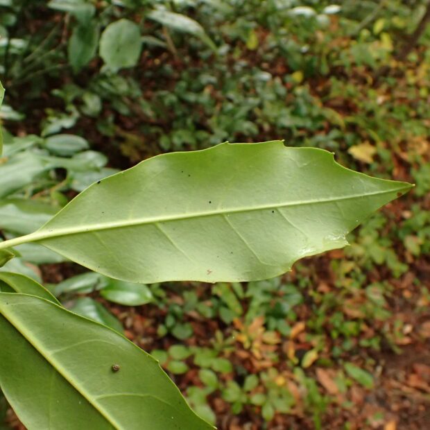 細長いだ円形で、 普通のアオキより小さめです。 厚く光沢があり、 縁は先の方の半分だけギザギザしています。