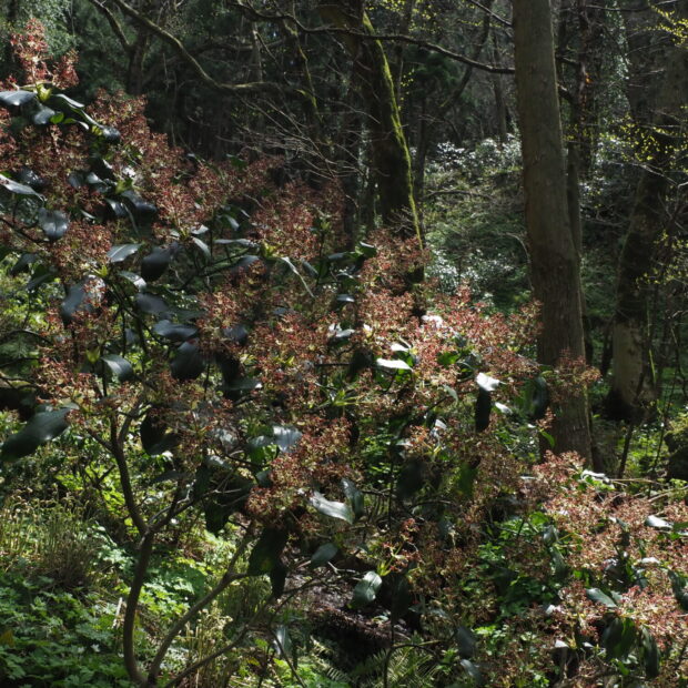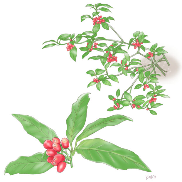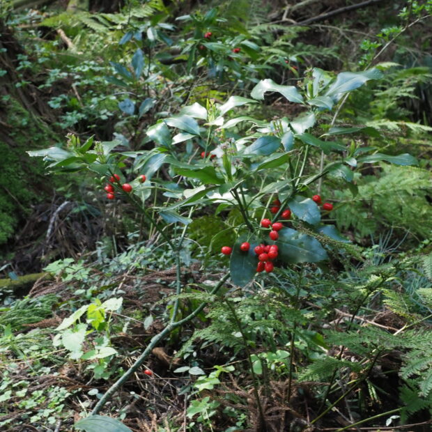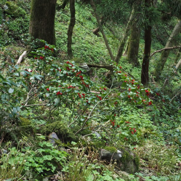 明るいところも好きですが、 大きな木の下の方の、 少し暗い森の中でも平気で暮らしています。 つやつやの葉っぱや、 つやつやの赤い実で「ここにいるよ〜」と静かにアピールしてきます。 雪に埋もれても、 しなやかな枝と幹で重みに耐え、 春になるとまた斜め上を向いて伸びていきます。