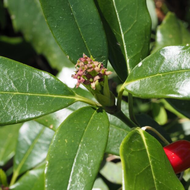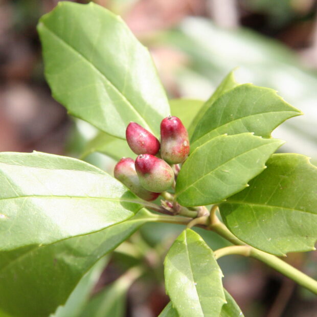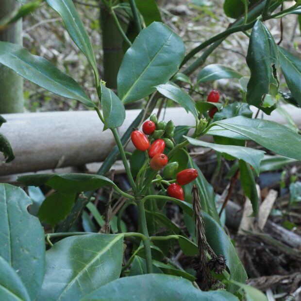 実は緑色から赤い実へと熟します。 冬から早春のころまで赤い実がついたままです。