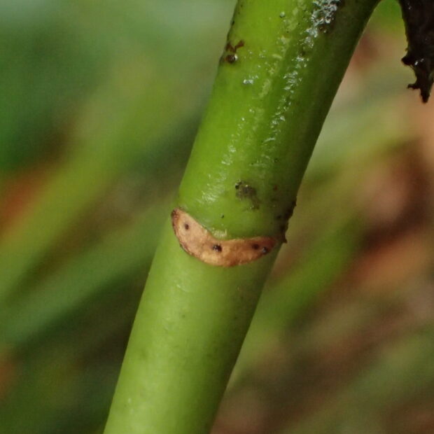 芽も緑色です。 枝先の大きな芽には次の春に咲く花が入っています。 葉痕の維管束痕は3つで、 お顔に見えます。