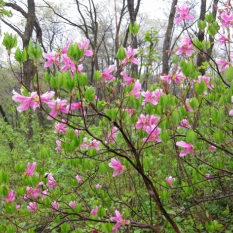 日本海側の雪の多いろころに分布するミツバツツジの仲間です。 葉が開くのと同じころに濃いピンク色の花を咲かせます。 「ミツバ」は、 枝先に3つの葉をつけることからきています。 葉の柄に毛がないのが特徴です。