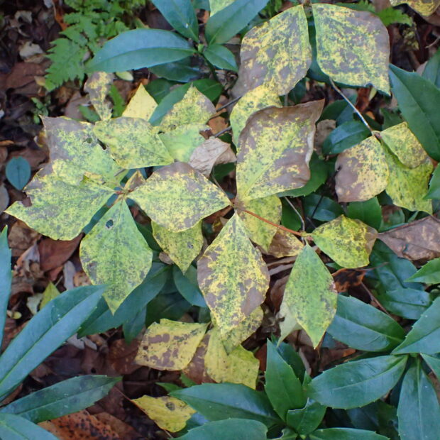 丸っこい菱形の葉で、 枝先に3枚並びます。 ミツバツツジの仲間は同じような形の葉をつけるので、 見分けることが難しいのですが、 付け根に近いところが少しくびれることが多いようです。 葉の柄に毛がないことも特徴です。 葉裏の付け根の葉脈のところには少し毛があります。