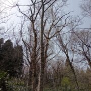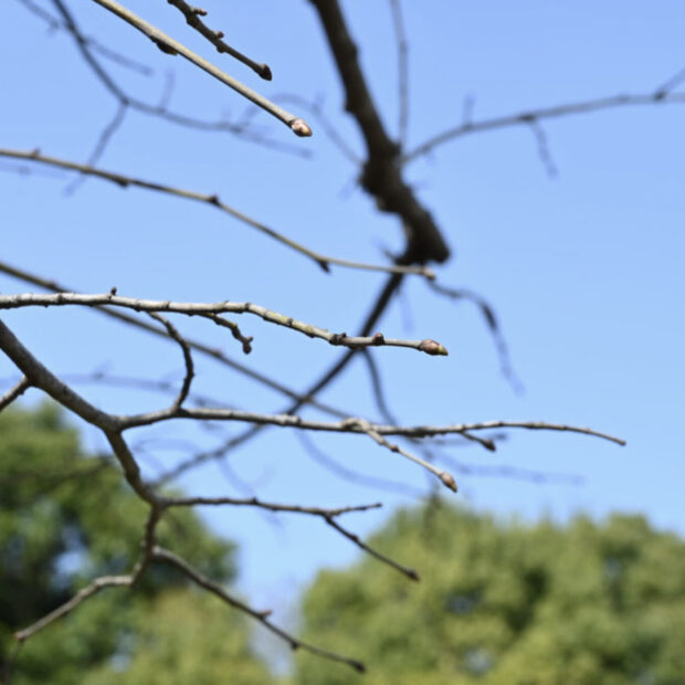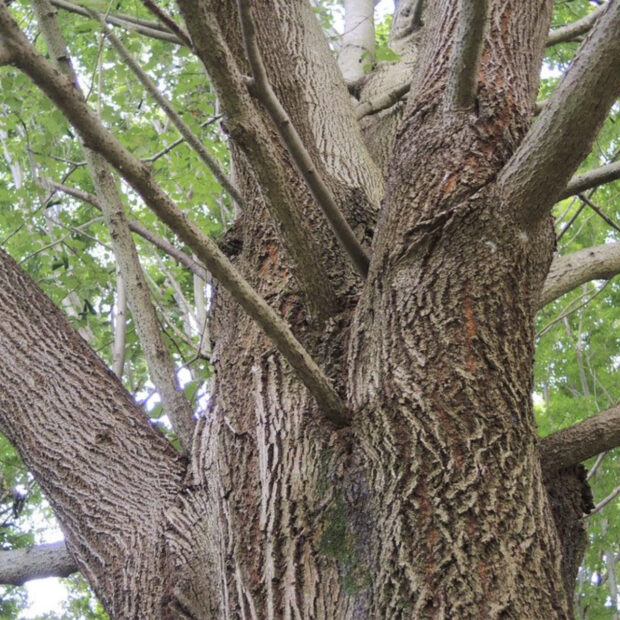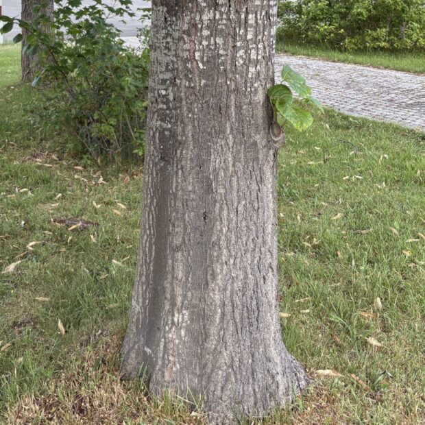 幹は灰色っぽい茶色です。 老木になると、 縦に細かい割れ目が入ります。 若木の枝の表面には、 細かい毛が生えています。