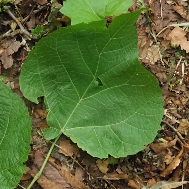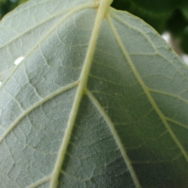 大きくて丸っこいハート形ですが、 少しゆがんだハートの形です。 先はピョロンと尖り、 縁にはギザギザがあります。 葉の裏には一面に毛があり、 ふわふわの触り心地です。