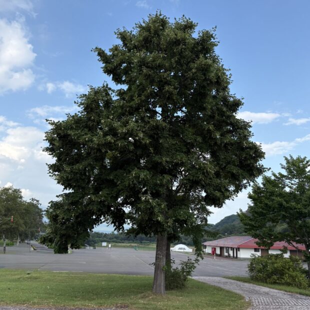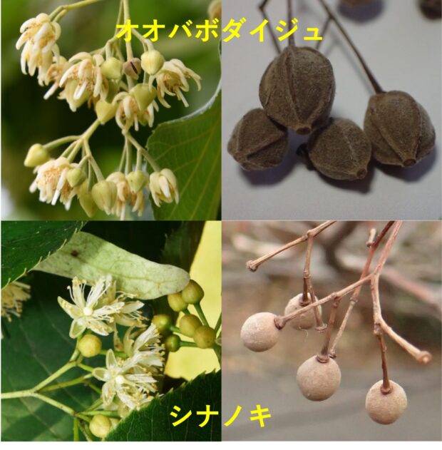 オオバボダイジュによく似たシナノキは、 北海道から九州までの山地に自生する木です。 オオバボダイジュに比べて葉は小さく、 表面には毛もなくてツルツルしています。 花の雄しべは花びらより長くて、 ふさふさと飛び出しているのが特徴です。 実は丸くて、 オオバボダイジュのように出っ張った「稜」はありません。