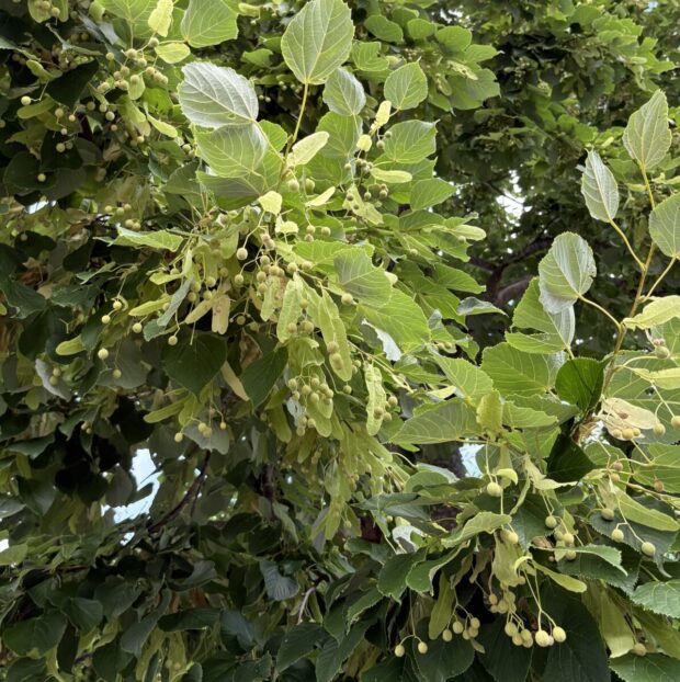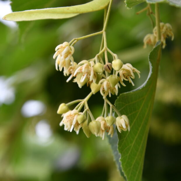 夏、 淡い黄色の小さな花を咲かせます。 花は柄の先に房のようにまとまり、 垂れ下がります。 さわやかで甘い香りがするので、 たくさんの虫が集まります。
