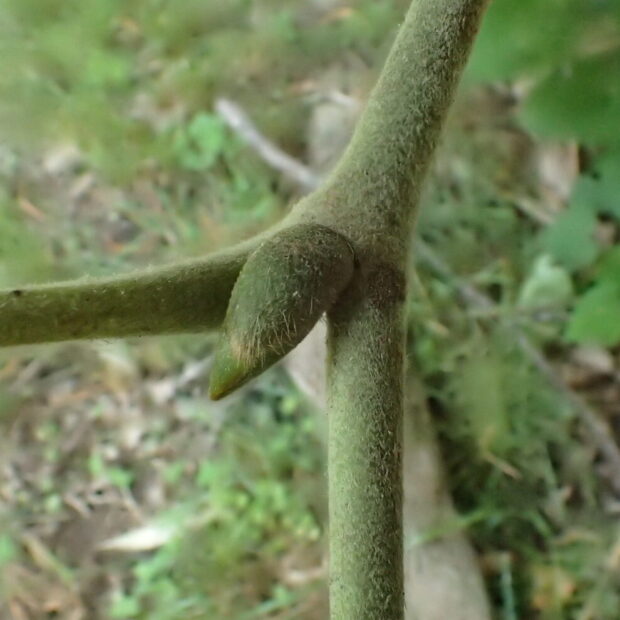 茶色っぽい赤い芽ですが、 表面に毛が多いので汚れた感じに見えます。 芽鱗は2枚で、 外側の芽鱗が小さめです。 葉痕の維管束痕は3つでお顔に見えますが、 残念なことにあまりはっきりしません。
