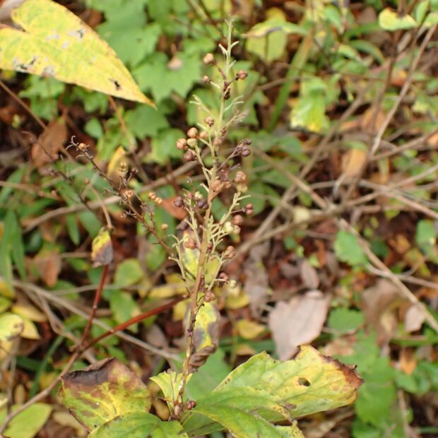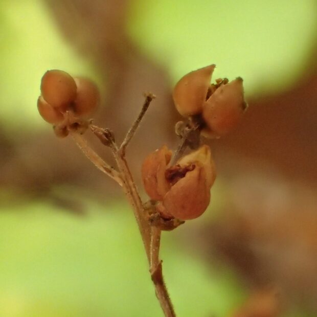 小さな丸い形をした果実が穂にたくさん実ります。 茶色く熟すとパカッと3つに割れます。