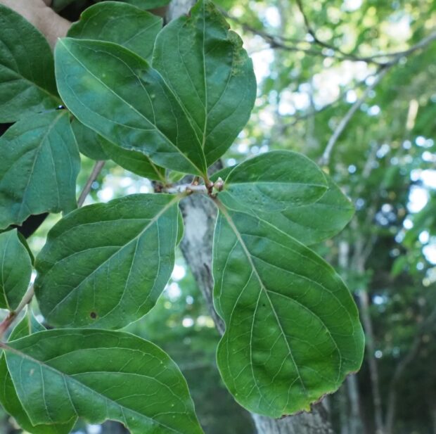 枝先に菱形のような形の葉がぐるりと5枚ほどまとまってつきますが、 互生です。 葉の縁は波打ち、 少しシワシワに見えます。