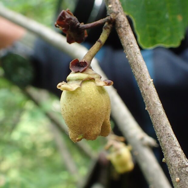 壺のような形の実で、 全体に短い毛が生えています。 熟すとビターチョコレートのような色になり、 割れると中から黒いピカピカの種が顔を出します。