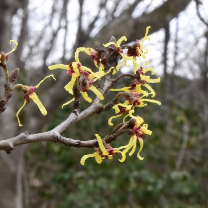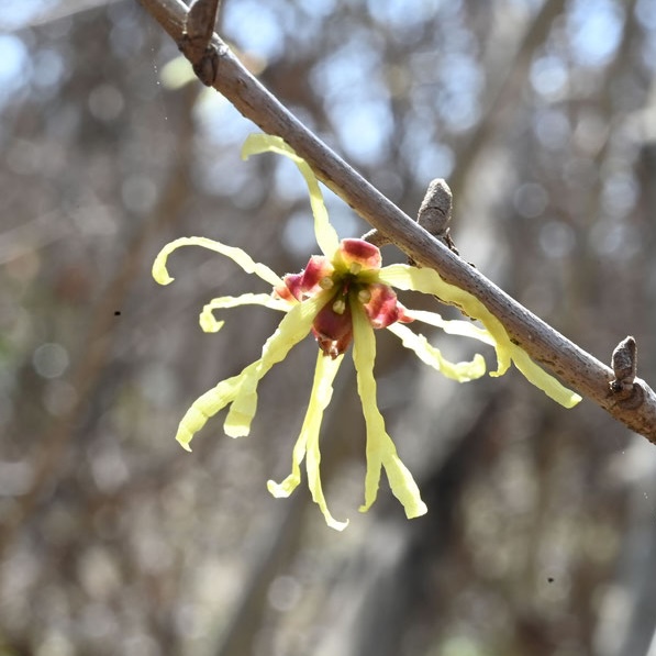 細長いリボンのような4本の黄色い花びらは、 初めは内巻きにクルクルとしまわれていますが、 春になるとほどけてきて外へピーンと飛び出します。