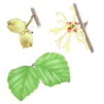 葉の形がマンサクに比べて丸く、 北海道や本州の日本海側に分布するのがマルバマンサクです。 雪の多いところに適応しており、 幹や枝がしなやかです。 雪の上を歩く道具「かんじき」や、 柴木などを縛るのに利用されていました。 「マンサク」の名は、 春に「まず咲く」ことからきています。