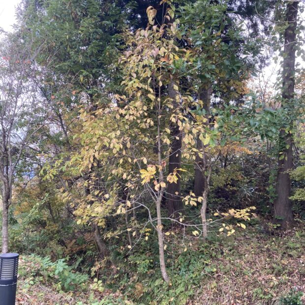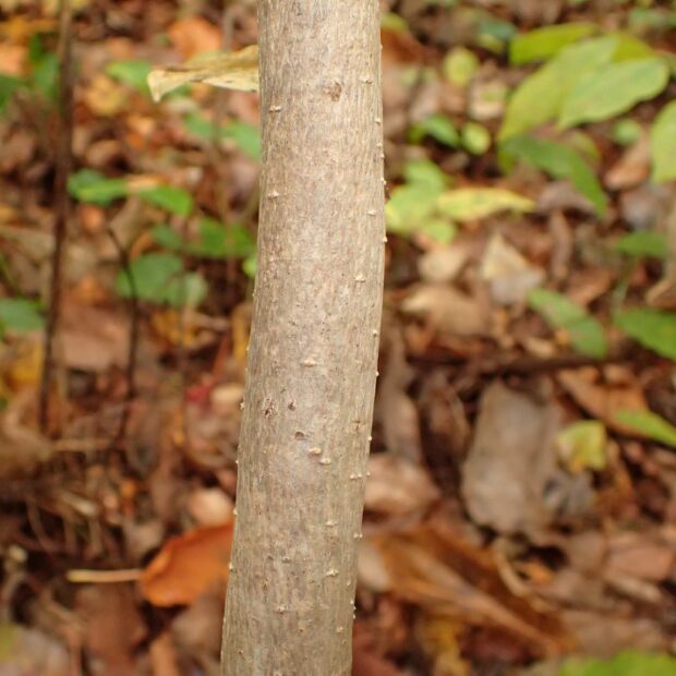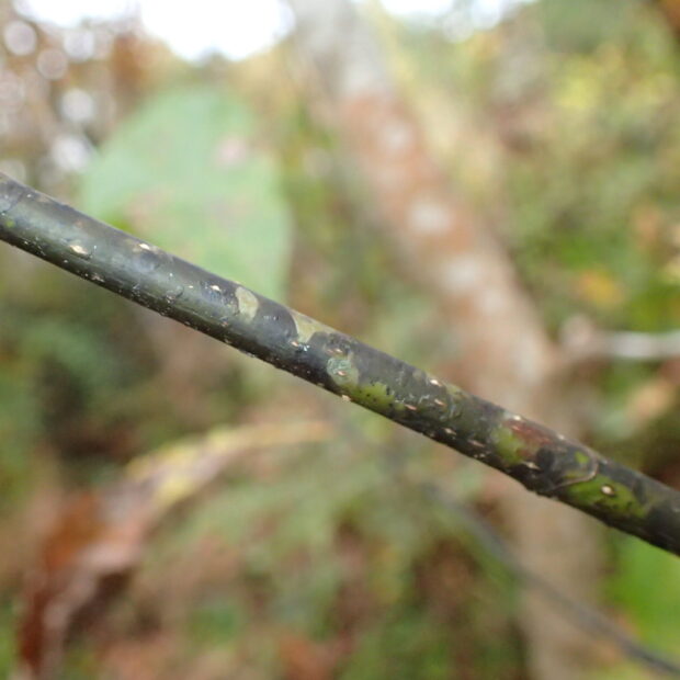 灰色がかった茶色で滑らかです。 若い枝は緑色〜黒っぽい色で、 ツルッとしています。
