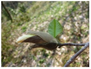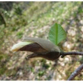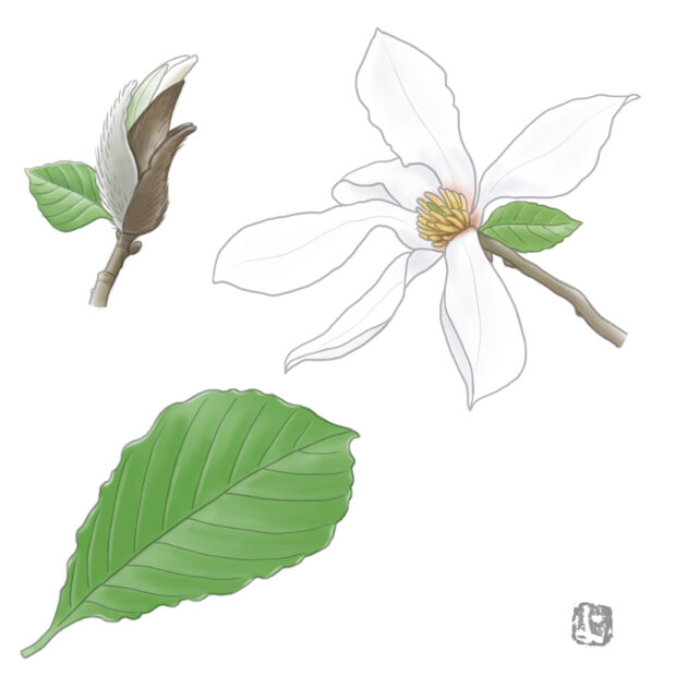 大きな6枚の花びらをもつ白い花です。 花の後ろにピロっと小さな葉っぱが1枚ついているのがチャームポイントです。 この特徴から、 同じ地域に生えるタムシバと区別できます。