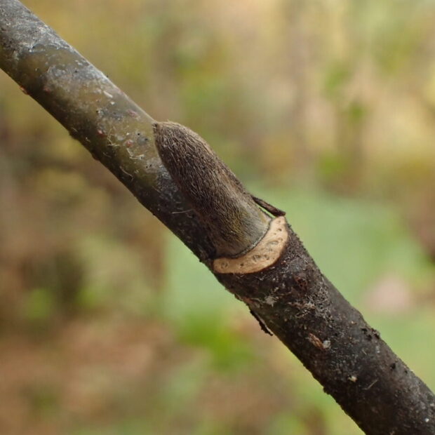 花芽はふわふわの芽鱗3枚ほどに包まれています。 1枚1枚が芽をすっぽり包む形のもので、 外側が一番ふわふわ、 中のものは薄くなっています。 それをくるり、 くるりと脱いでいき、 花びらが現れます。