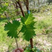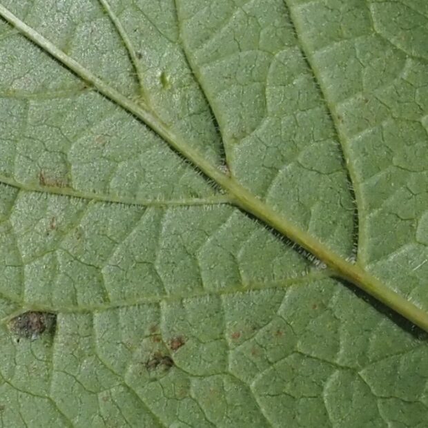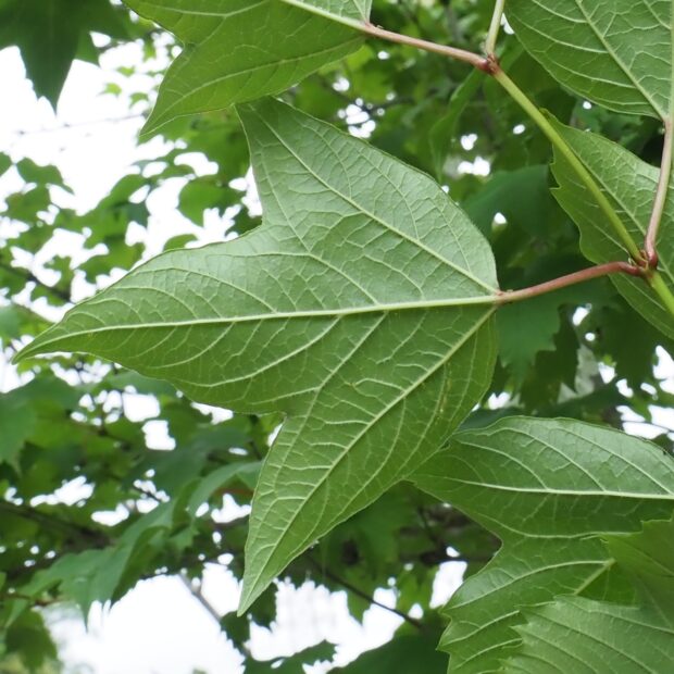 対生で、 カエデのように分裂した葉です。 分かれた葉の先の方にギザギザがあるのが特徴ですが、 ギザギザがない葉もあります。