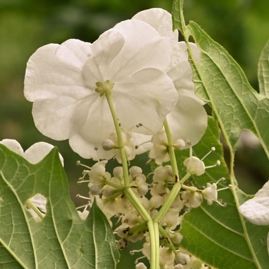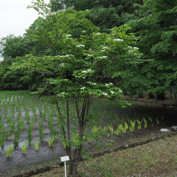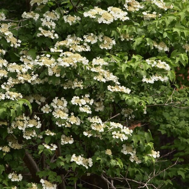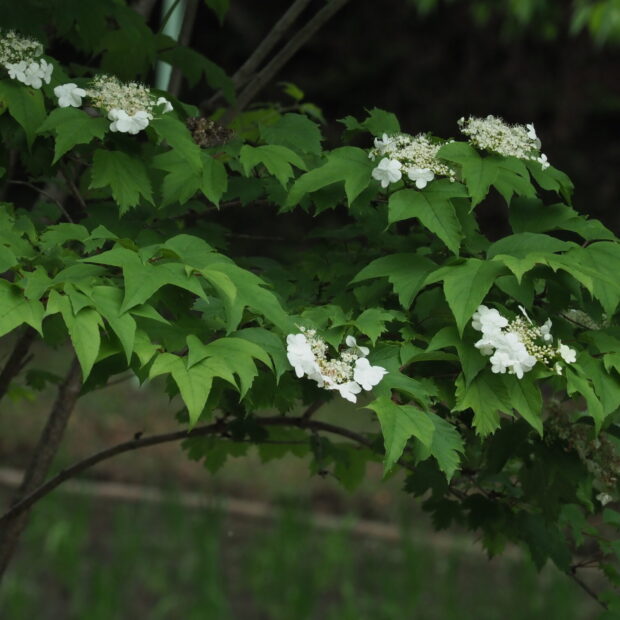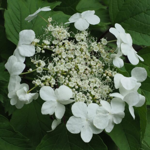 春にガクアジサイのような白い花を咲かせる低木です。 花の周りに大きな白い装飾花がぐるりと咲き、 後から真ん中に集まる小さい花が咲きます。