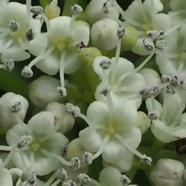 中心に小さな花が集まり、 その周りに白い花が飾りのようについています。 ガクアジサイに似ていますが、 装飾花も中心の花も密に並びます。