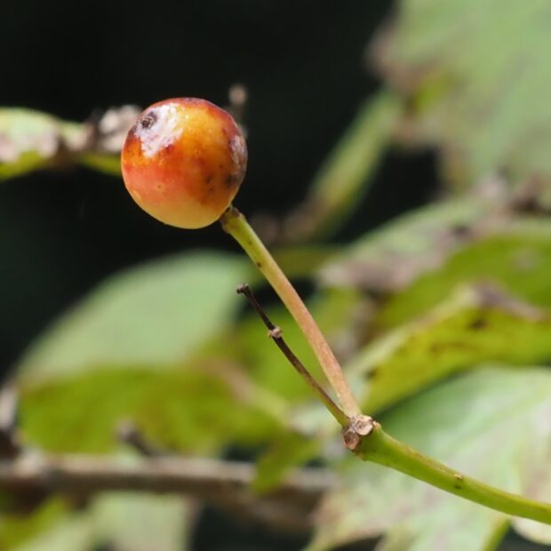 秋になると小さな赤い実をたくさんつけます。 熟しても苦味が強く、 鳥たちにも不人気かも。 葉が落ちても赤い実だけが枝にたわわに残ります。