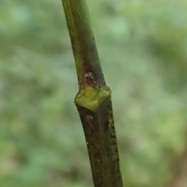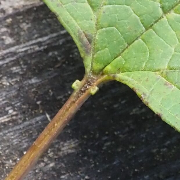 葉の付け根には、 密を出すポチッとした腺点があります。