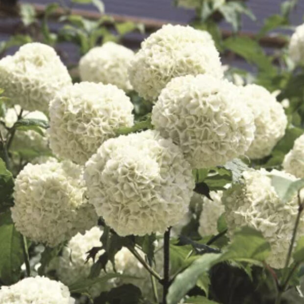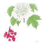 枝や葉柄、 花柄に毛があるものを「ケカンボク」とよびます。 観賞用に栽培されている「テマリカンボク」には両性花がなく、 多数の装飾花が集まってボール状になり、 手毬のように見えます。