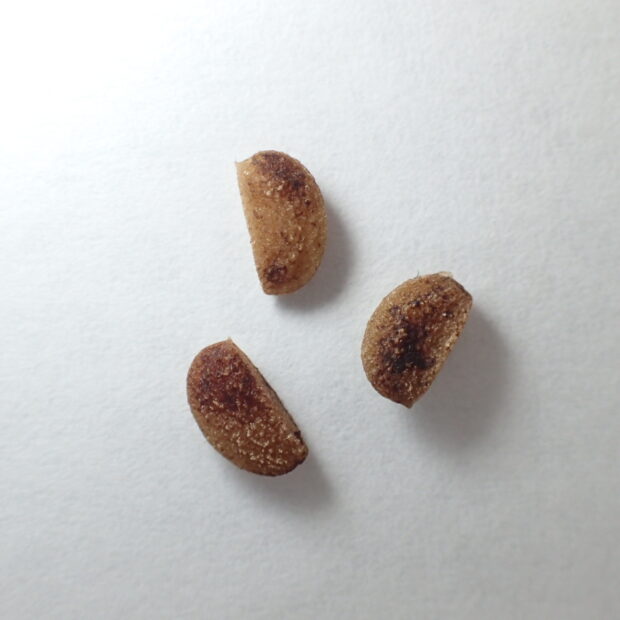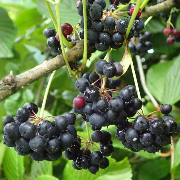 夏に赤っぽい茶色〜紫がかった黒色に熟します。 転がりそうな丸い玉や、 転がらなさそうな少し平らな玉の形のものもあります。