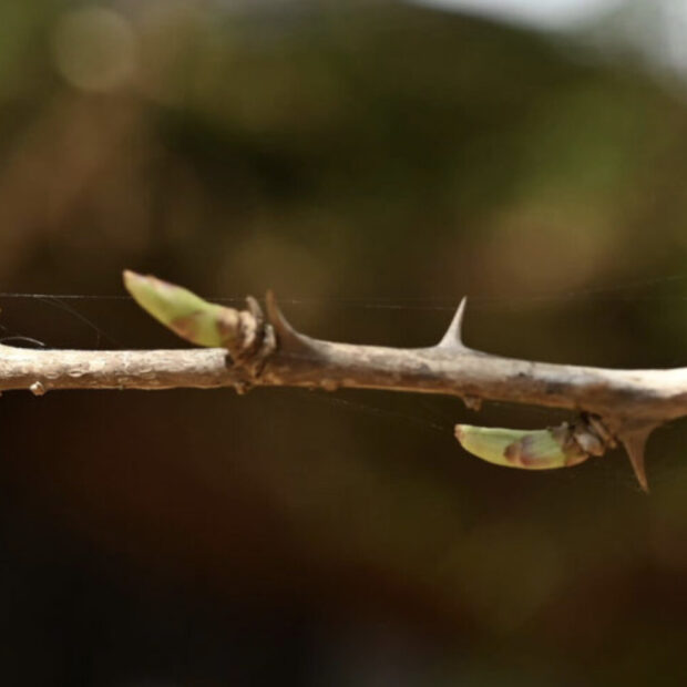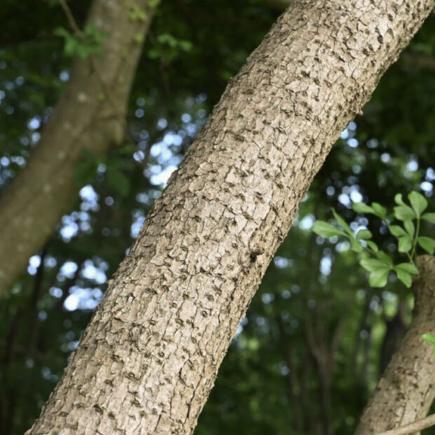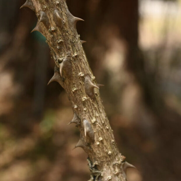 樹皮は黒っぽい灰色で、 縦の筋とポコポコした皮目がたくさんあります。 枝にはトゲがたくさんあり、 横から見ると鋭いくちばしをもつ鳥の頭のように見えます。