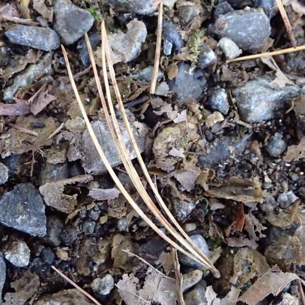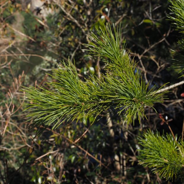 細い針のような葉が5本で1つの束になり、 枝から放射状にたくさんつきます。 少しカーブした1本の葉の横断面は三角形で5本をギュッとまとめるときれいにくっつきます。 アカマツやクロマツの葉は2本の葉で1束になっています。