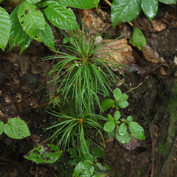 松ぼっくりの中から飛んでいったタネが着地し、 山の中で芽を出していることがあります。 成長が遅いので、 大きくなるのにはとても時間がかかります。